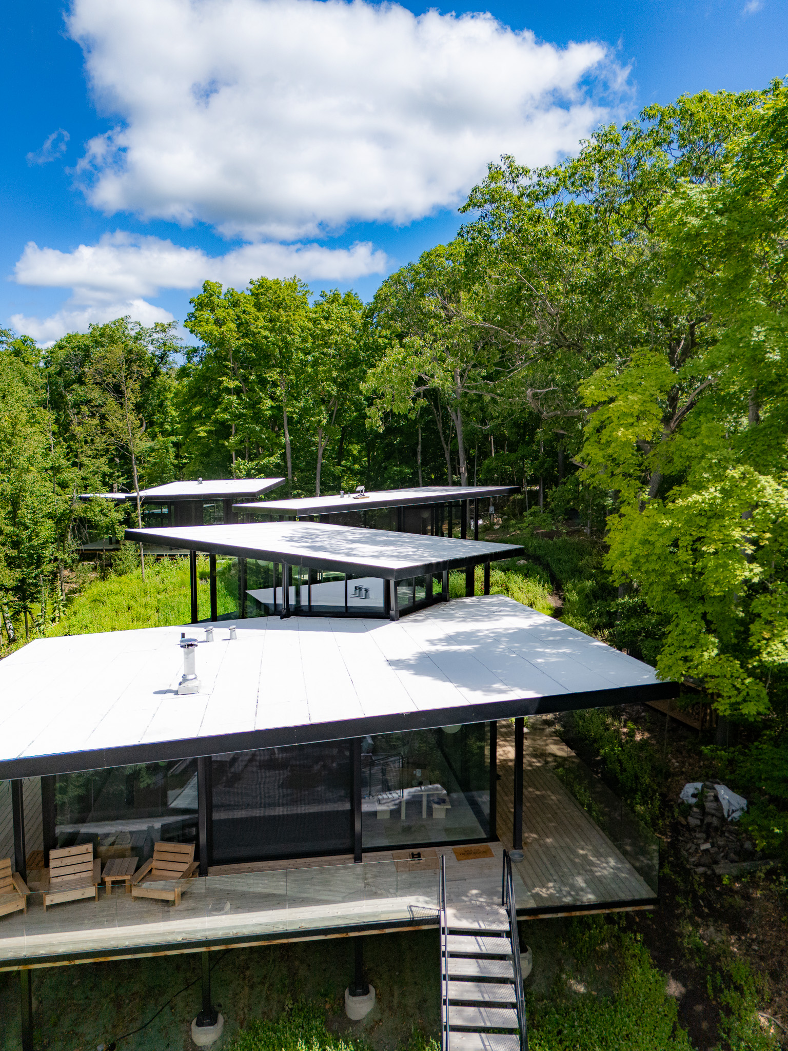 Nestled on a narrow granite ridge rising above a pristine lake in Ontario, the Devil Lake House, also known as Project West Devils Lake, is a visionary design by NO ARCHITECTURE. Conceived as a series of seven elevated glass pavilions, the structure dissolves boundaries between interior and nature, creating seamless connections to forest and water.